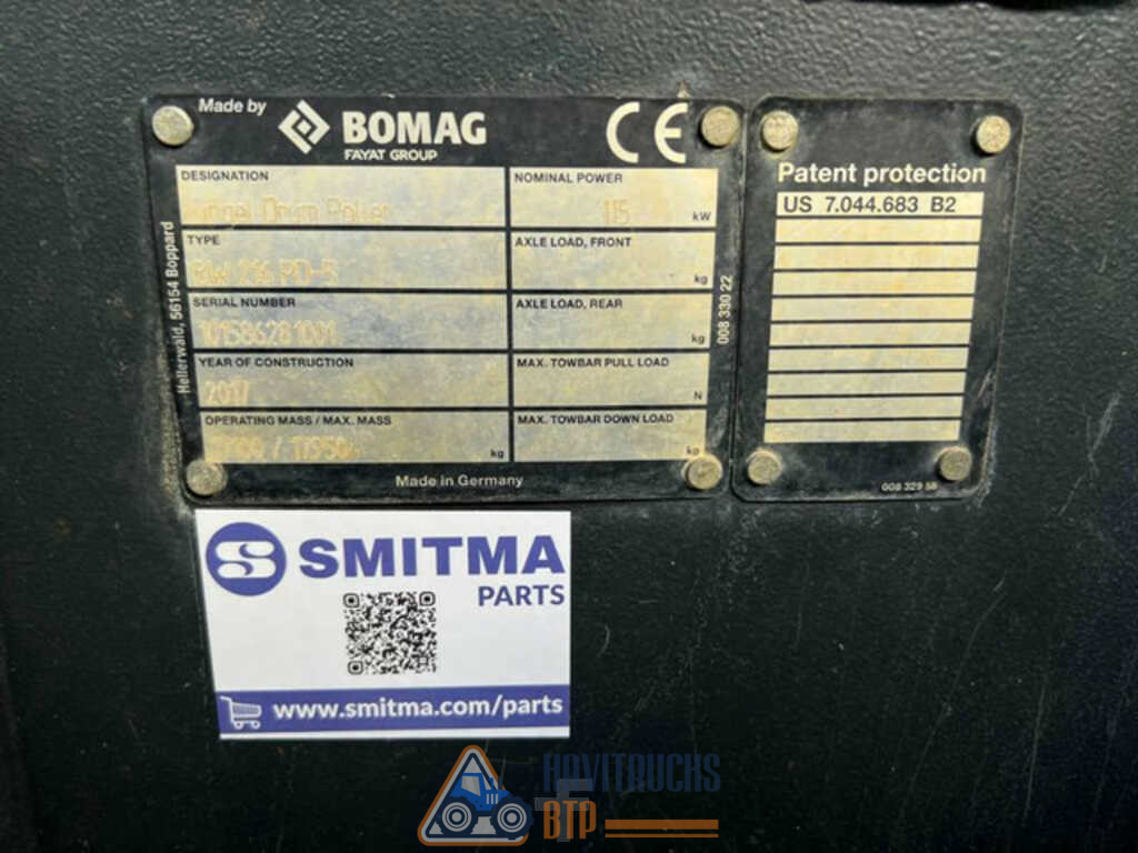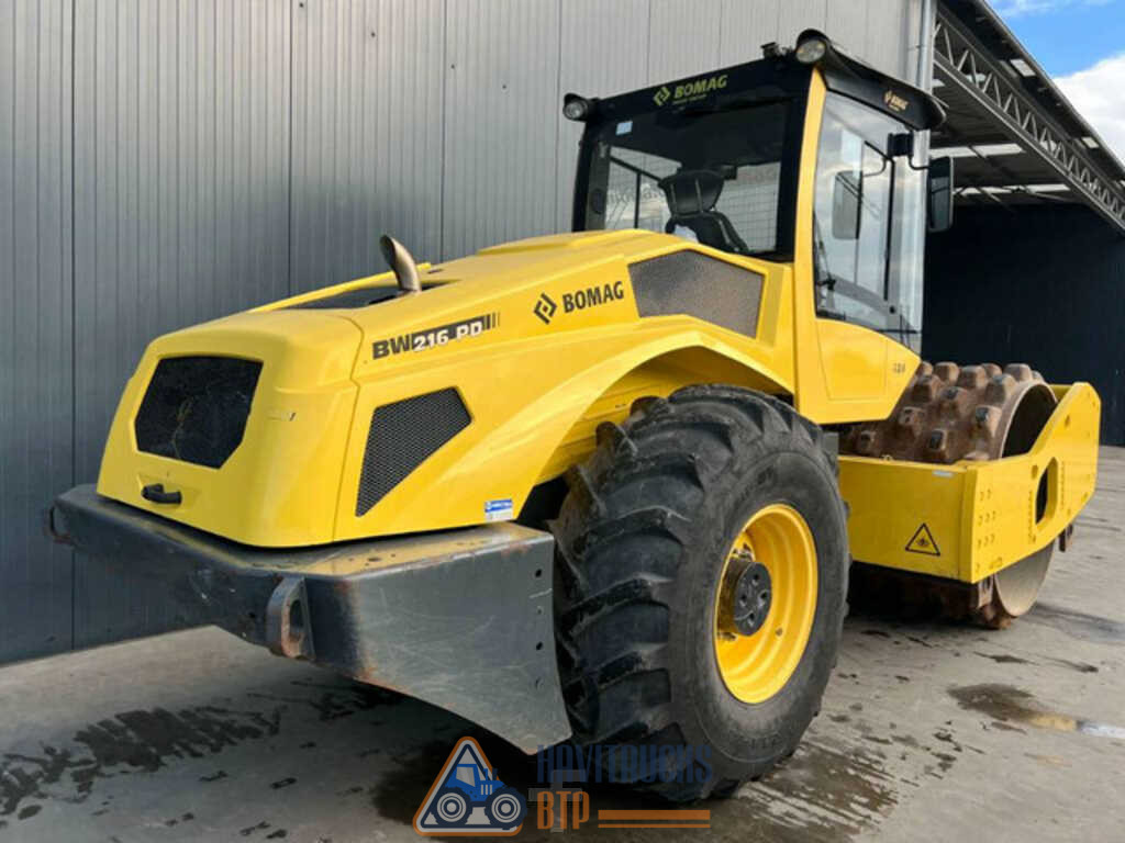 La gamme lourde. Nos modèles lourds. Prêts pour tous les défis. Tous les chantiers de construction ont une chose en commun : ils exigent que le sous-sol assure la portance. Voilà pourquoi les rouleaux monocylindres jouent un rôle crucial dans la construction. Cependant les conditions et environnements divergent considérablement. Par exemple, un constructeur qui travaille à proximité d’un lotissement met en œuvre une toute autre méthode que celle utilisée pour construire les routes. BOMAG propose une large gamme de rouleaux monocylindres adaptés à chaque type de chantier. BW 211–BW 216-5 : ces modèles ont été conçus pour les grands projets comme le compactage sur un chantier important ou la construction de routes, à l’intérieur comme à l’extérieur. Marque BOMAG Type Compacteur monocylindre Modèle BW216PD-5 Numéro de châssis 101586281001 Année 2017 Heures de service 2,446 Curb weight 17.100 kg Entretien simple Un design intelligent pour une maintenance simplifiée. Notre concept de maintenance s’appuie sur un objectif clair : moins d’entretien, moins d’arrêts et moins de frais. Ainsi notre design vise à supprimer les points d’entretien inutiles et rendre les points nécessaire mieux accessibles. Par exemple, aucun de nos rouleaux monocylindres n’a de point de graissage. La jauge d’huile, les filtres, les points de remplissage ainsi que les vannes de purge sont facilement accessibles depuis le sol. Ou encore le tampon en caoutchouc sur le rouleau : il se remplace sans le retirer du bâti. Une maintenance simple, c’est avant tout un vrai concept. Elle résulte avant tout d’une technologie intelligente et d’une approche pratique de notre design. Spécifications Standards BOMAG ECOMODE Différentiel autobloquant Essieu arrière avec deux freins hydromécaniques Entraînement hydrostatique de la translation et de la vibration Direction hydrostatique Blocage de l’articulation Siège réglable avec accoudoirs Interrupteur de batterie Levier de commande de la translation avec commande de la vibration intégrée Avertissements, informations et indications de service à l’affichage LCD Mode de chargement Arrêt d’urgence Eclairage travail AV / AR Alarme de recul 2 Racleurs à ressorts Klaxon Options * Cabine avec ROPS/FOPS et ceinture de securite fenêtre coulissante Arceau ROPS/FOPS avec ceinture de sécurité Caméra de recul Climatiseur Radio (Bluetooth) Chauffage auxiliaire Pack Confort: Siège réglable et colonne de direction réglables Gyrophare Clignotants à l’avant et l’arrière BOMAG ECOSTOP ECONOMIZER TERRAMETER BOMAG TELEMATIC POWER Peinture couleur spéciale Coquilles pieds dameur (D) Huile biologique Interface pour les techniques de mesure et les données machine d’autres constructeurs Avertisseur sonore avec tonalité à large bande pour la marche arrière LED Éclairage de travail (Cabine) Avertisseur sonore avec tonalité à large bande pour la marche arrière * Série pour livraison conforme aux normes CE (pour pays de l’Union Européenne uniquement)