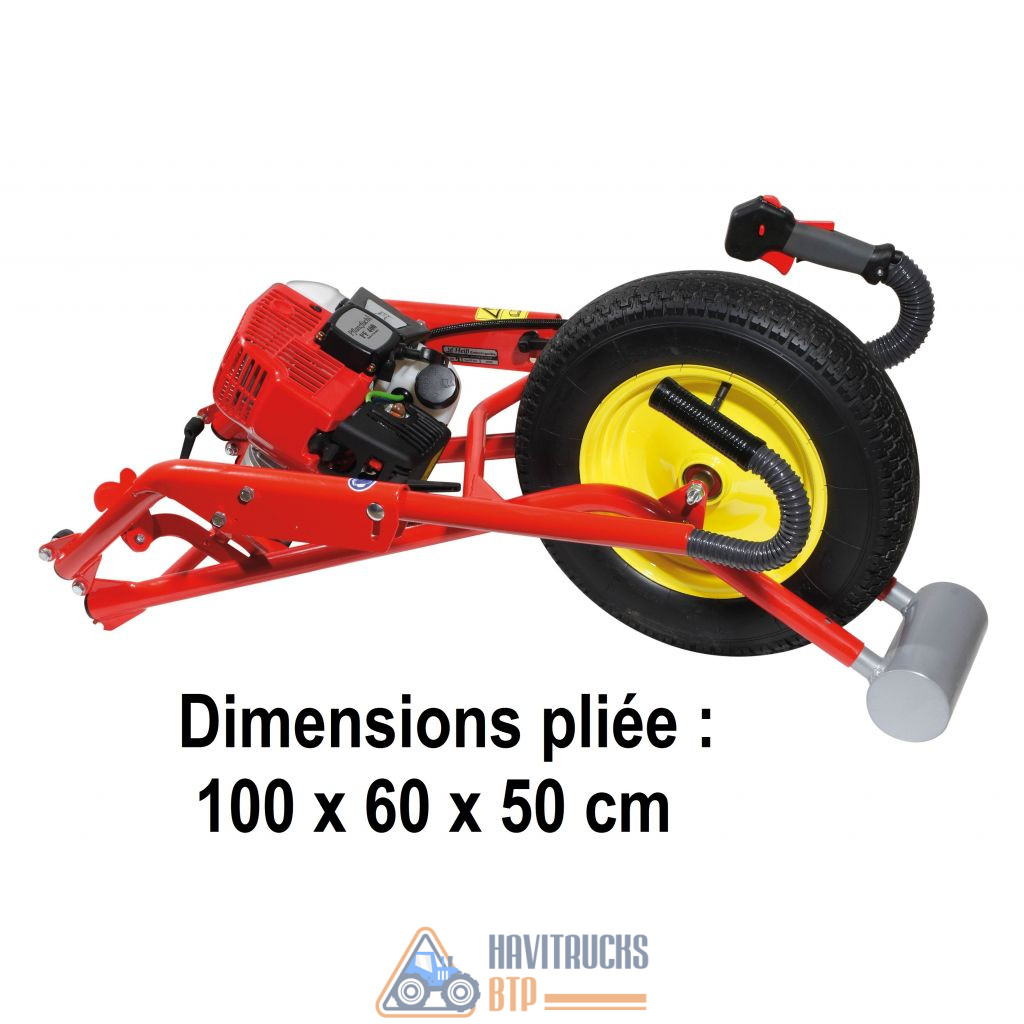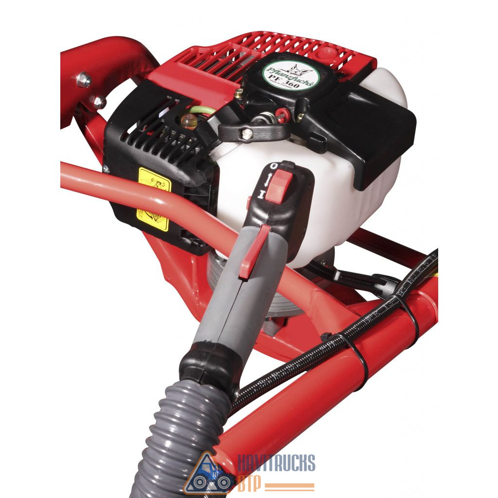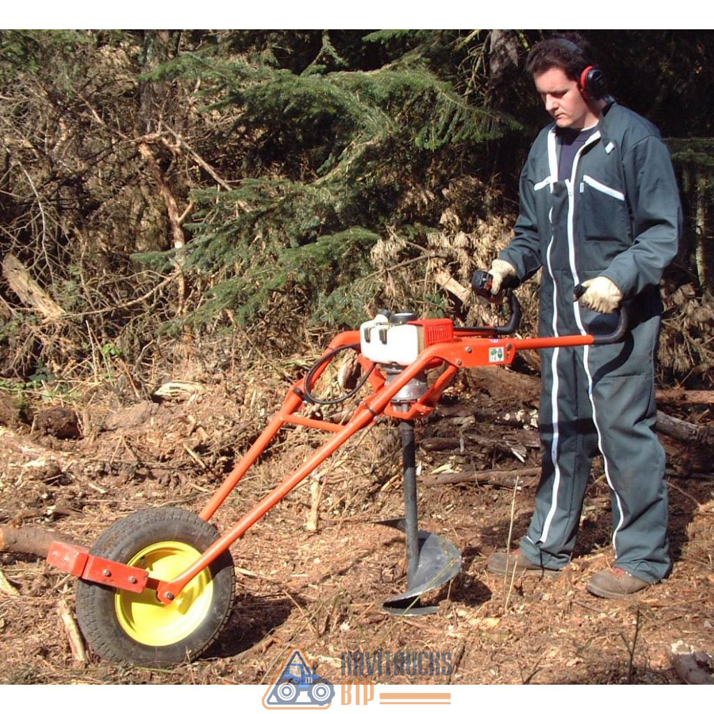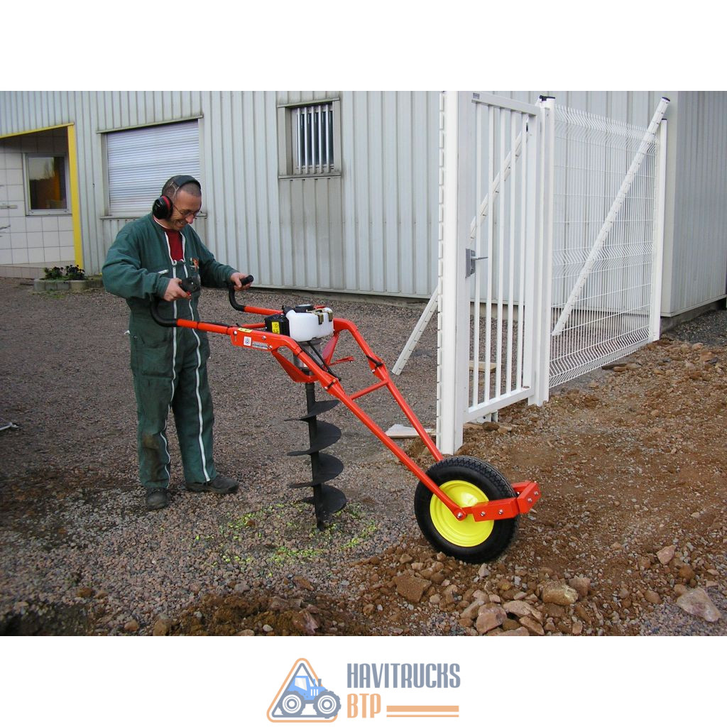 Tarière Thermique brouette modèle PF360 Moteur 2 temps 55 cc (2,8 cv). Réducteur planétaire, réduction 50:1 Couple à l’arbre de transmission 160 Nm. Système brouette très pratique : un seul opérateur perce des trous de 60 à 300 mm de diamètre dans le sol, sans fatigue et en toute sécurité et confiance. Performante même en sol pierreux tout en restant sûre à utiliser. Efficace, facile à transporter, à déplacer, rapide à mettre en place : un choix vraiment professionnel. Cette tariere peut recevoir toutes les types de mèches de 60 à 300 mm de diamètre (voir dans produits complémentaires) Pour la pose de clôtures, pose de piquets, trous pour poteaux, panneaux, plantation etc… Permet de réaliser une plantation grâce à l’emploi de mèches spéciales (forestières, émietteuses, coniques ou cœur). Le châssis brouette breveté, avec sa roue lestée, est une révolution : la roue absorbe le couple de rotation et évite tout effort inutile et tous les à-coups dans les bras de l’utilisateur. De plus, lorsque l’opérateur relève la mèche chargée de terre par le brancard, le bras de levier offert par la roue au sol réduit considérablement l’effort nécessaire. Le lest placé devant la roue est réglable, ce qui permet d’ajuster l’équilibre selon le poids de la mèche. Le châssis est pliable, par un système à verrouillage rapide, pour un transport aisé dans le coffre d’une berline. Conforme aux normes CE (Oscar de la Sécurité remis par la MSA d’Aquitaine au salon Forexpo) Fabriquant : PFLANZFUCHS (ALLEMAGNE)