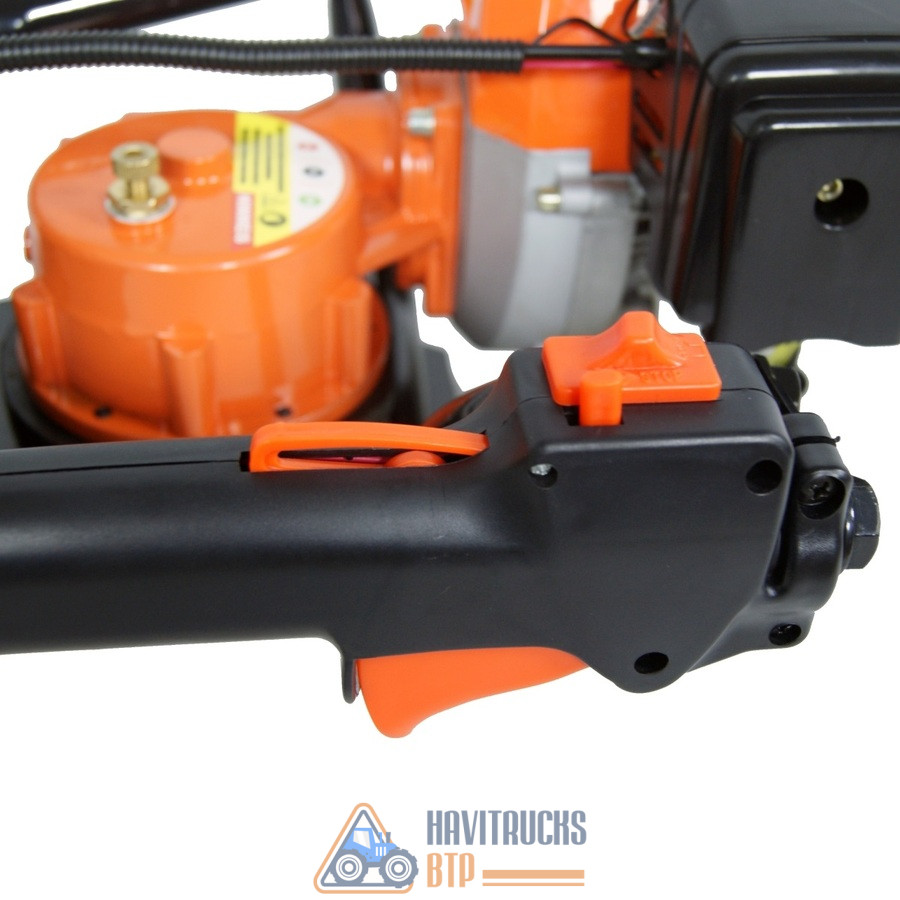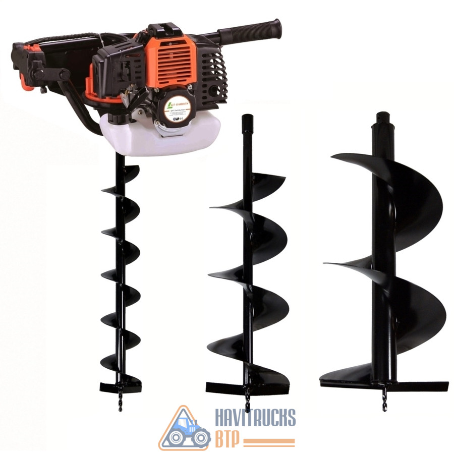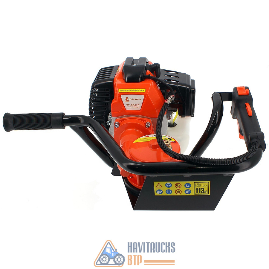Une vaste gamme de mèches et de rallonges est disponible pour vous permettre de réussir vos plantations de végétaux, pose de poteaux, clôtures, etc. Cet outil vous permet de réussir vos plantations de végétaux, pose de poteaux, clôtures, etc. Système de débrayage en cas d’obstacle. Caractéristiques techniques : Marque française : GT GARDEN Modèle : TT-GD520 Moteur : 2 temps refroidi par air Homologation : CE, TÜV, GS Cylindrée : 52 cm3 Puissance : 3 CV (2.2 kW) Vitesse : Variateur de vitesse Embrayage : Centrifuge Démarrage : Au lanceur. Démarrage facile (pompe d’amorçage primaire) Carburateur : A membrane (utilisable dans toutes les positions) Poignée : Gainée Carburant : Mélange SP98 (E5) + 2,5% d’huile de synthèse pour moteur 2 temps Volume du réservoir d’essence : 1.2 litre Poids : 8.9 kg (poids hors carburant et mèche) Notice en Français : Oui Contenu du colis : Tarière thermique 52 cm3 Mèches de diamètre 100, 200 et 300 mm Longueur des mèches : 80 cm Bidon pour mélange Clé à bougie et tournevis Garantie et livraison : Garantie : 2 ans Pièces de rechange en stock permanent Livraison rapide